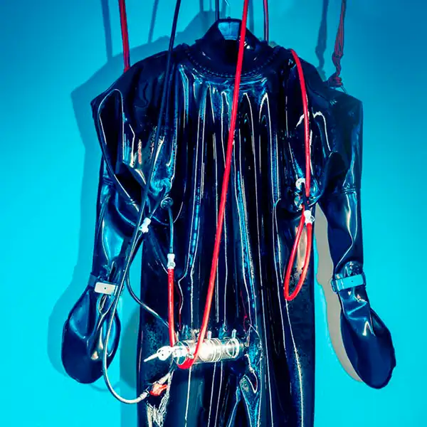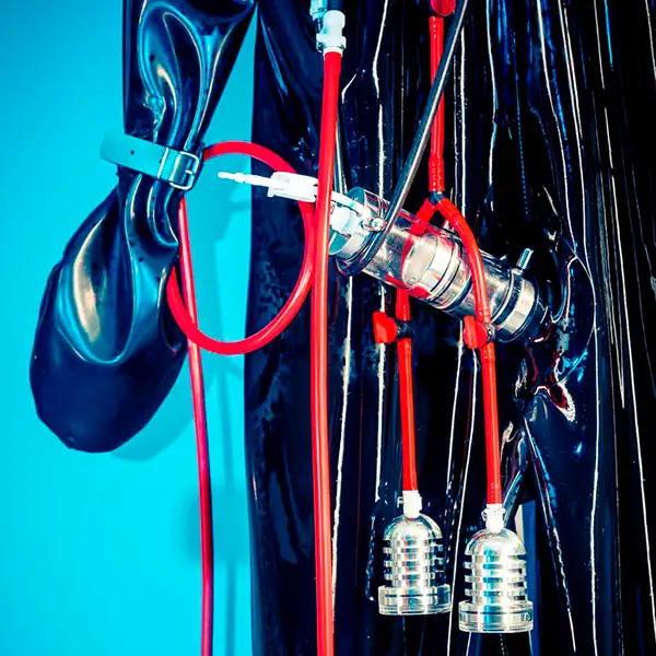 Der „Vacuum Suit“ ist ein massiver 4 mm dicker Gummianzug der deinen Körper eng umschließt – wenn du in den Anzug schlüpfst, wirst du vollständig in eine luftdichte, flexible Hülle eingepackt, die eng an deinem Körper anliegt. Der Vakuumeffekt wird durch eine Pumpe erzeugt, der im Intervall die Luft aus dem Anzug zieht und so den Druck verstärkt, wodurch du ein einzigartiges Erlebnis zwischen Enge und Freiraum erleben wirst.